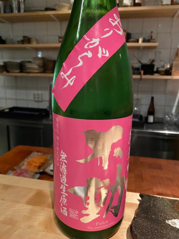 A pretty pink label with white and silver writing was the next sake tasted. As the colour of the label suggests, this is a fun sake, easy to drink and quite popular at the moment. It is an Origarami おりがらみ – as can be read on the neck of the bottle. It is a little cloudy, slightly spritzy, fresh, with very fruity tones, a hint of vanilla and some sweetness. This is a result of the sake being unfiltered 無濾過, unpasteurised 生 and with a high rice polishing ratio. It is also non-diluted 原酒 and at 17% abv, a little higher in alcohol. You can pick up this information through the kanji on the left side of the label. (Fudoh Junmai Ginjo Origarami Nama from the brewer Nabedana in Chiba Prefecture)