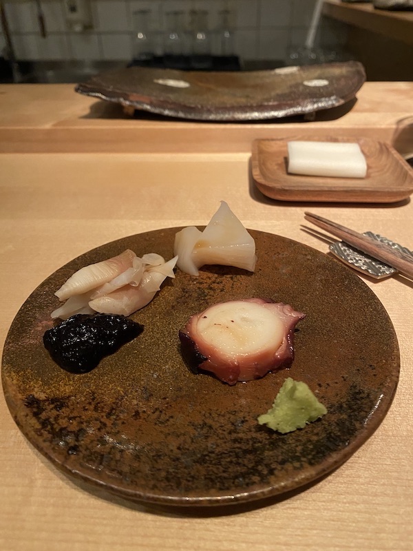 On the other side of the road, tucked away behind a small windowed front is Sushi Sho, an unassuming cosy eatery with an L-shaped bar that seats twelve people. The sushi is served omakase お任せ, meaning the meal is left up to the chef, and he will have selected only the best and freshest produce in season. The food is presented as otsumami お摘み, the Japanese equivalent to tapas, i.e. small dishes to pair with drinks .